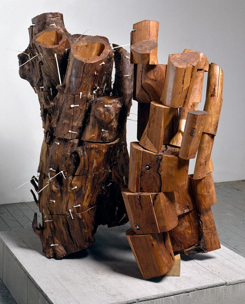 Over the years the bases have ranged from welded steel to wooden stands to concrete blocks to metal pipes, at first bringing smaller pieces to eye level, now supporting large-scale wooden clusters. In many works since 2007, a hollowed-out block serves as a base for the interior pieces, which have been glued together into a new configuration or, in some cases, the exact shape they had before being excavated from the block.