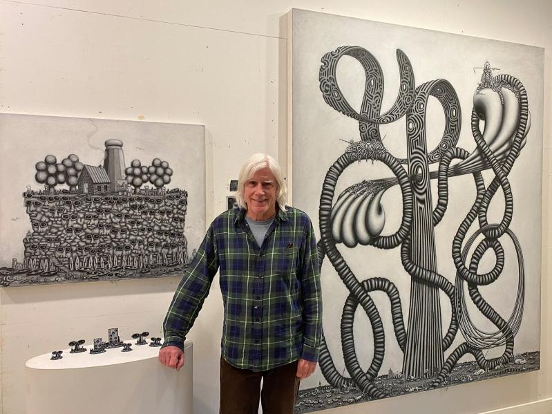 That led to a series of monumental black-and-white paintings inspired by palm trees, lighthouses, even a Calder mobile, although those "muses," as he calls them, were only the starting points for works of remarkable complexity. What links them is that each has a dominant component that sits atop a horizon line or ground, which becomes the site of a profusion of images.