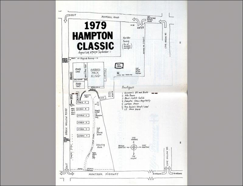 The show continued to be at Dune Alpin Farm through 1981. The map seen here, drawn by the newspaperman Dan Rattiner, shows the layout at Dune Alpin in 1979. Five hundred riders were expected that year. There was a Grand Prix ring and two additional rings, plus space for schooling or warmups.