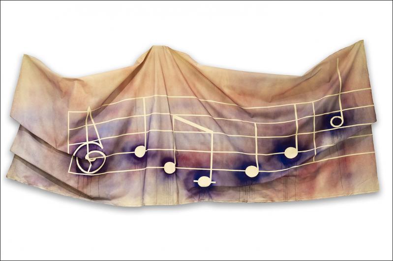 The show included “Oh Say Can You See: A Draped Sound Painting,” in which she painted the first few notes of the national anthem on cloth, hung the cloth loosely on the gallery wall, and paired it with a recording of the notes. That piece, part of the Parrish exhibition, is typical of the artist’s approach to the technical possibilities of canvas, cardboard, paint sprayers, sound, and sewing equipment.