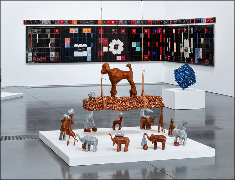 In the center of the gallery is “Dog on Beam” and “Dog and Pony Show,” both from 1993. All of the animals are made from copper wire, aluminum wool, and aluminum frames. The main dog and a ball are balanced on a beam above the other animals. A relatively rare instance of figuration, it reflects her embrace of a wide range of materials.