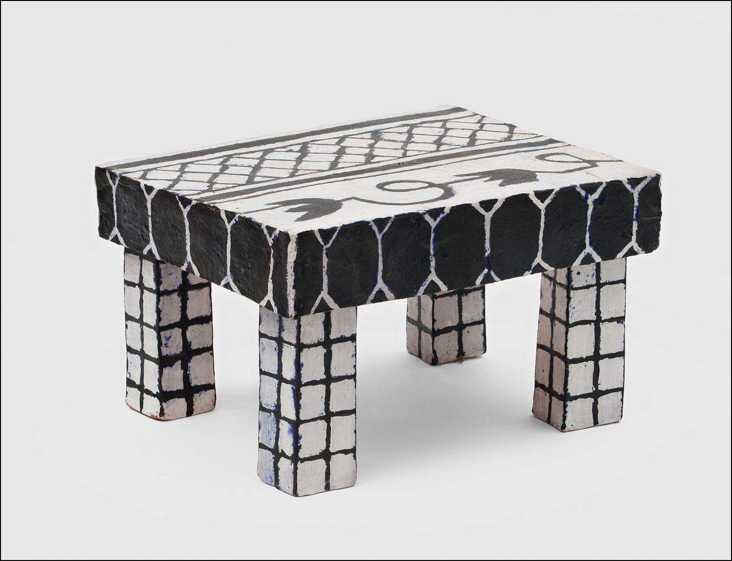 Geometric and botanical motifs are often juxtaposed within a single object. The layered brushwork of glazes and stains that enhances Ms. Kley’s bisque-fired terra-cotta vessels and sculpture is sometimes articulated with sgraffito, a pottery technique that involves carving through slip or underglaze.