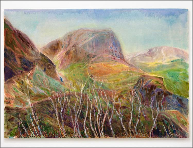 Brant’s paintings feature a figure or figures that appear as part of a landscape narrative. Drawing from old black-and-white photos, vintage postcards, film stills, and album covers, Brant builds landscapes with figures that reflect on movement and transformation.