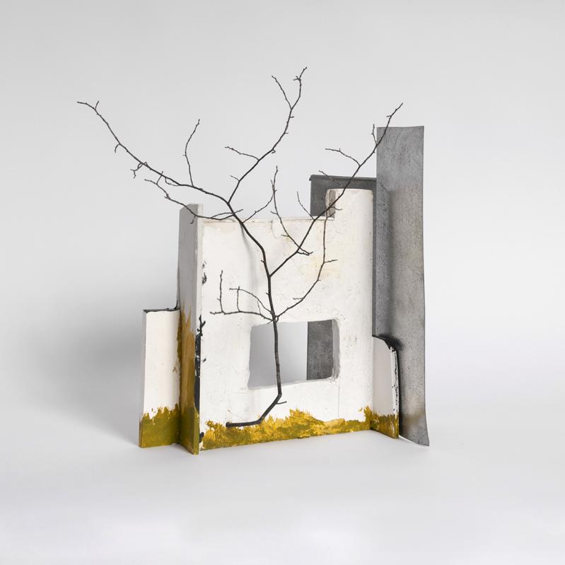 Webber, who lives and works in Sag Harbor, continues to explore the combination of home-building materials with found elements from the natural world. Branches grow from ruins and encircle architectural forms, while fields of color produce shifts of light and shadow. In a statement, Webber wrote, “Branches, once part of a living canopy, now engage in a dialogue with the architecture we’ve created — embracing its lines, piercing its planes, or rendering themselves as fine, intricate lines that interact with its imposed geometry.”