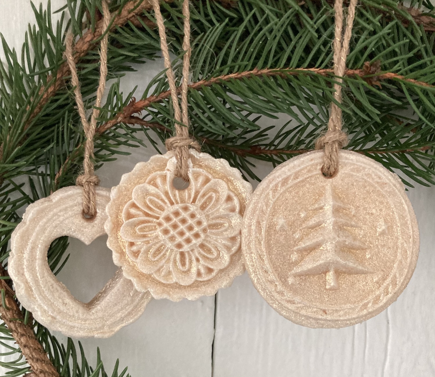Allow the ornaments to air dry for at least 24 hours right on the tray before baking for two hours in an oven heated to 250 degrees. Note that the longer they stay in the oven, the more they will take on a golden hue; you may even find you prefer that look. Remove from oven and cool completely on a wire rack.