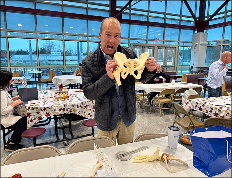 Erik Peterson, a physical therapist in Amagansett, brought models of pelvic bones and shoulder joints to show to students with an interest in physical therapy. “I’m just introducing them to what physical therapy is and what the opportunities are in a career in physical therapy, what it takes to get into a physical therapy school, to get through physical therapy school, and what they can expect to see as potential jobs as they get out,” Mr. Peterson said.