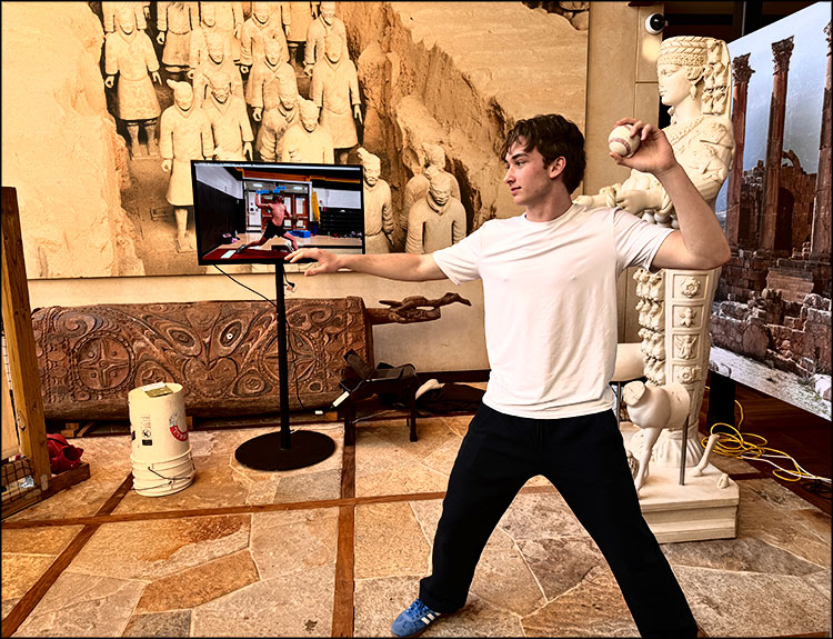 Just beyond “The Spider-Table,” Tate Foard, a baseball player, created PitchVision, a pitching practice system that uses motion-tracking technology and automated ball-throwing return, so pitchers can practice on their own. Its two-camera setup provides mechanics analysis to help players improve their form and prevent injury.