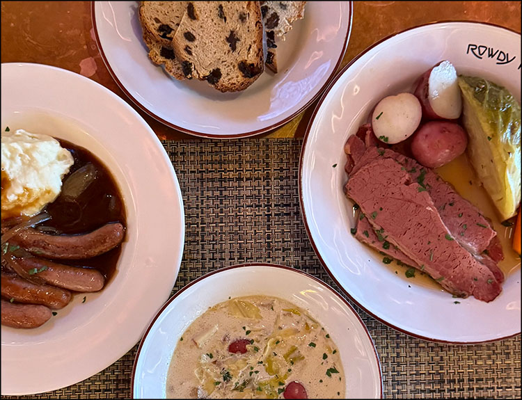 The main course specials are corned beef and cabbage, with green cabbage, carrots, potatoes, and mustard, or bangers and mash, featuring Irish sausage, mashed potatoes, and onion-brown gravy. Both come with Irish soda bread.