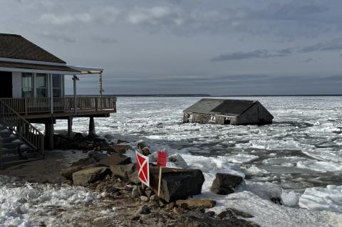 A much-photographed house on stilts that was surrounded by water since around 2004 fell into Gardiner’s Bay last weekend when the pilings holding the abandoned house, perched off the end of Mulford Lane on Napeague, snapped. On Friday, it slipped further into the frozen water.