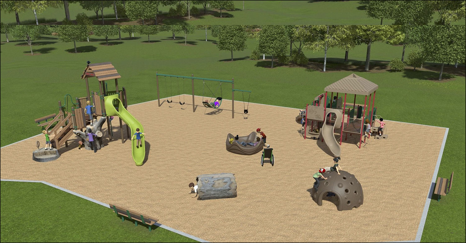 A large playground structure with a slide, lookout tower, steps and climbing tree, and a log crawl tunnel were also part of the park’s proposed layout. Benches would be included along the perimeter.
