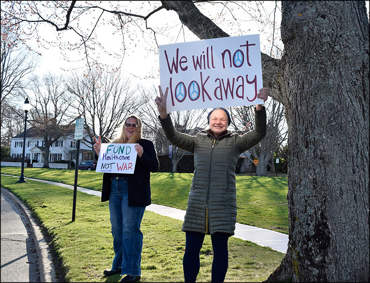 Holding signs reading “No war,” “No war crimes,” and “We will not look away,” the gathering lined Pantigo Road as a steady chorus of approving horns were sounded by passing motorists. Alyson Follenius, an organizer of weekly Beacon for Democracy gatherings that have taken place at the Hook Mill over the past year, was briefly at a loss for words.