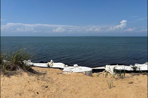 A house on Bay View Avenue in Amagansett, infamous for a temporary wall of beach-blocking geocubes that stayed for years, was before the town Z.B.A. as its owners presented an environmental review of a plan to build a permanent 108-foot-long rock revetment.