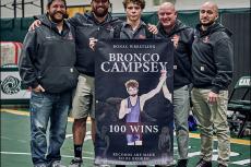Bronco Campsey, East Hampton’s star wrestler, is the first Bonacker to achieve 100 wins in almost 40 years, notching wins 100 through 103 in competition at Westhampton Beach last weekend.