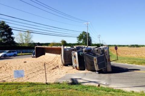 A tractor trailer carrying sand flipped over onto its side on Brick Kiln Road in Bridgehampton Friday morning. The driver was airlifted to Stony Brook.