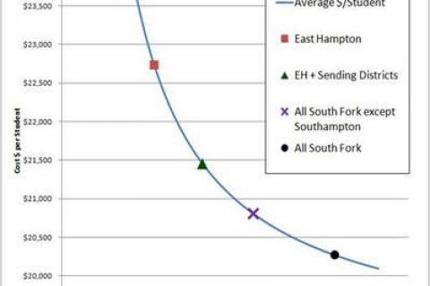 Per-Pupil Costs Point To ConsolidationReasons for combining all the public schools on the South Fork into one consolidated district were described at a meeting of the East Hampton School Board Tuesday night.