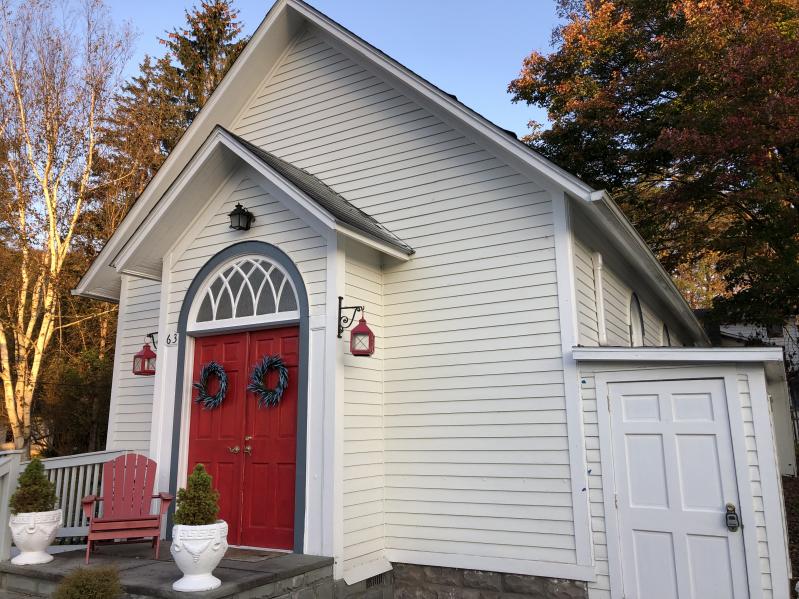 Or rather us. My elder daughter was a touch “freaked out” upon setting foot on the blood-red carpet running up the center aisle of The Nest, where we spent two nights over the weekend upstate in Margaretville, at the former St. Margaret’s Episcopal Church, which is virtually unchanged since its active, worshipful use just a few years ago. Pews, pulpit, baptismal font, candlesticks the size of fenceposts, collection plate, and even, tucked away beside a keyboard just waiting to call forth the spirit in song, an 18-inch plaster of Paris Mother Mary. (Just hold the “Blessed Virgin” part.)