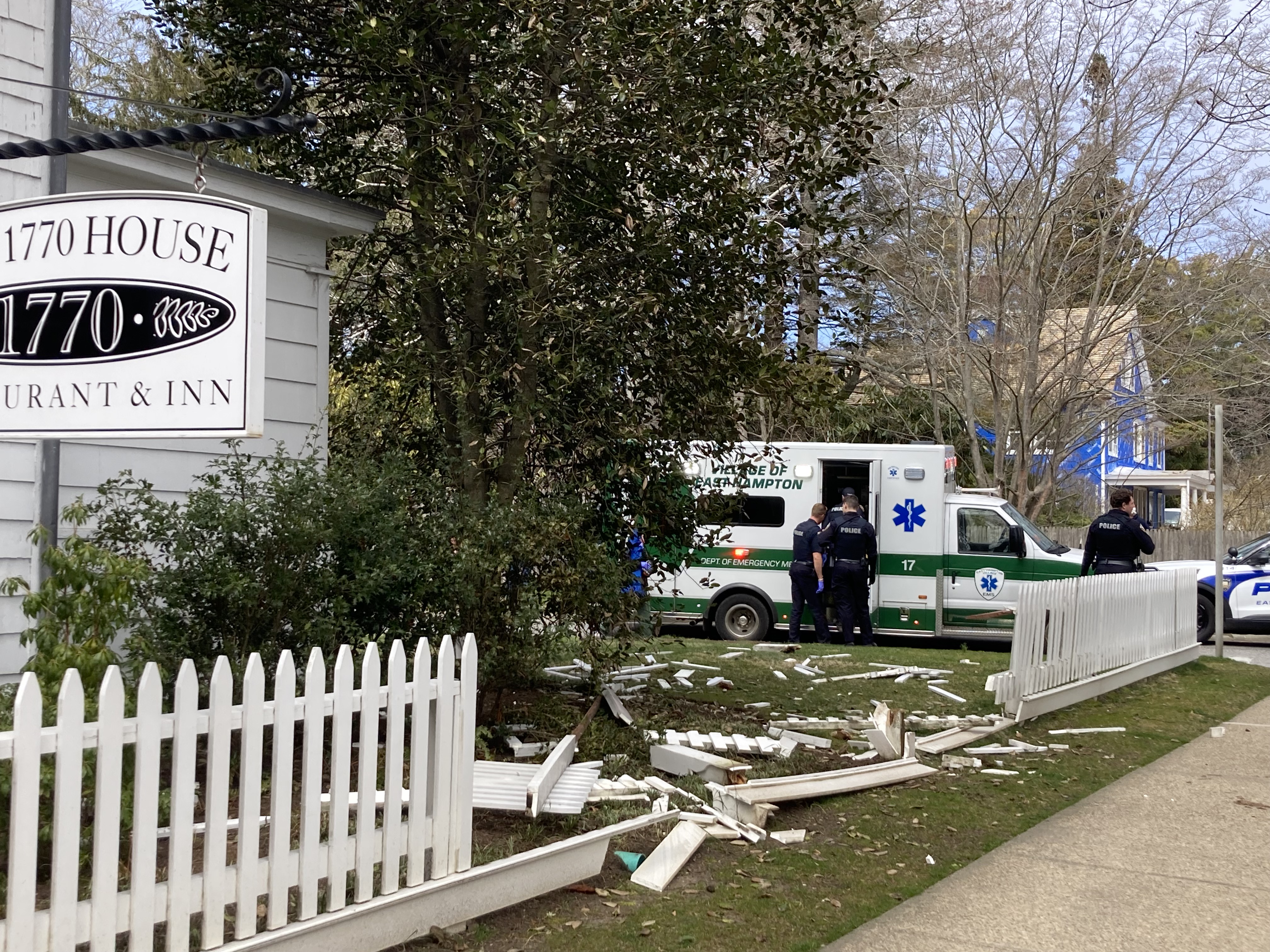 Reports of a Jeep driving through the fence in front of the 1770 House inn and restaurant began around 1:20 p.m. Friday. Village police said the vehicle hit a tree after driving through the fence.