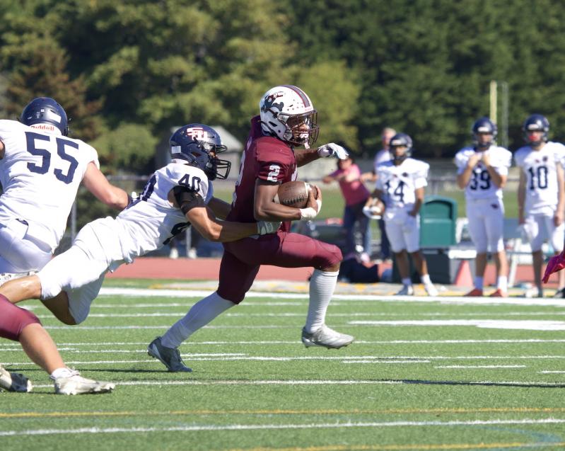 Highlights included Jai Feaster’s 145 yards on nine carries with two rushing touchdowns, plus five tackles and a sack. Alex Davis, who along with Feaster hails from Bridgehampton, ran for two touchdowns. Livs Kuplins, an East Hampton senior, had three receptions totaling 70 yards, including a 17-yard touchdown catch. He also had a 50-yard touchdown run.