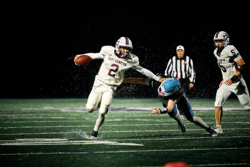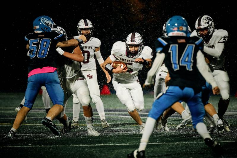 The pouring rain last Thursday didn't dampen the Bonackers' spirits. Jackson Ronick, a junior running back, put East Hampton on the scoreboard with an 87-yard touchdown run on the second series of the game. On a night when the rain complicated East Hampton's passing game, he finished with 213 yards on 20 carries.