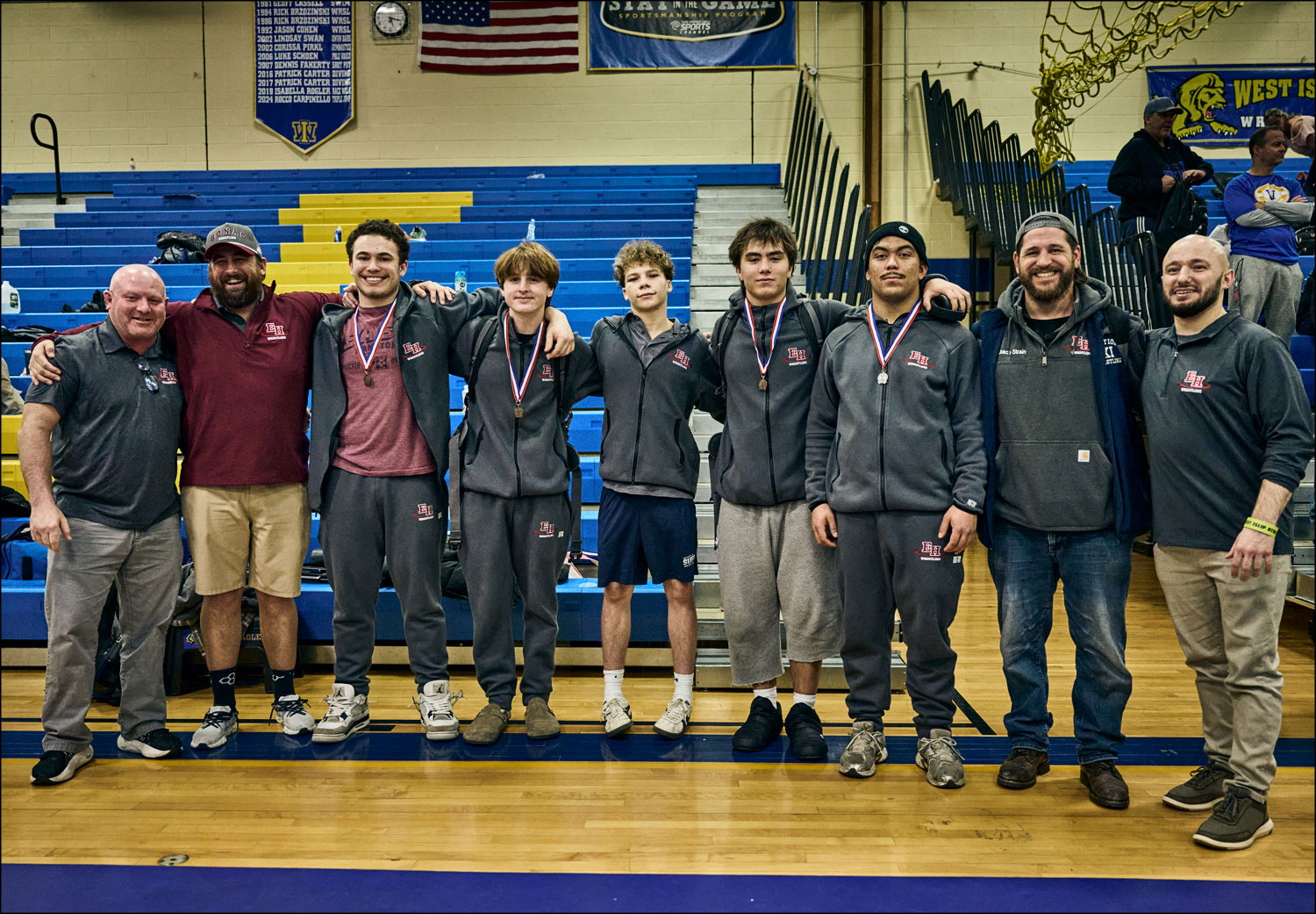 Francesco Palombino, a senior, finished third in the 285-pound weight class, making him a two-time league finalist. He received a bye in both the first round and the quarterfinals. In the semifinals Palombino was pinned by Dominick Green of Hauppauge. He came back in the consolation semifinals, pinning Antonio Anastasia of West Islip. Palombino then pinned Robert Shershenovich of Comsewogue in the third-place match.