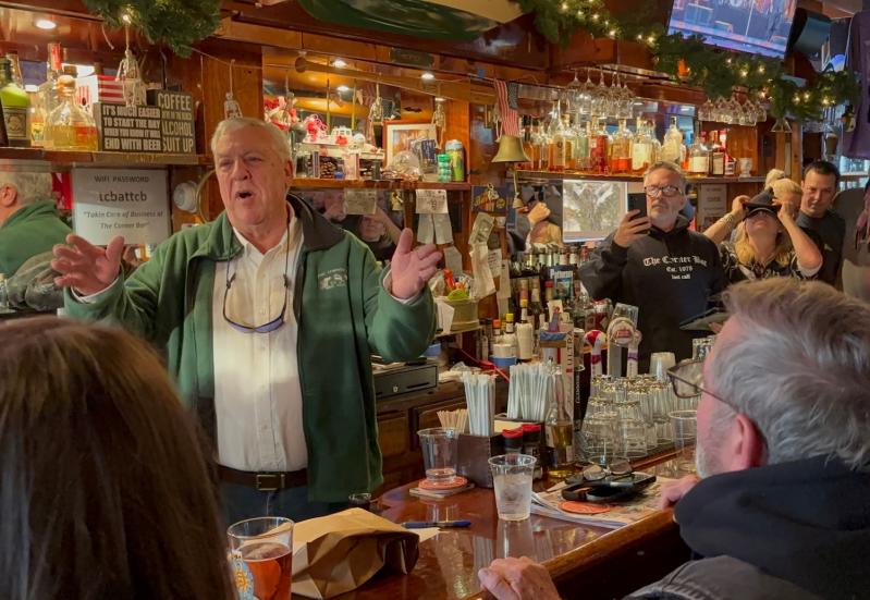 Tom Fabiano, a former Sag Harbor Village police chief, sat in the corner seat at the bar. When it seemed the place was at capacity, he walked behind the bar and rang the last-call bell to get everyone’s attention before he gave a short speech.