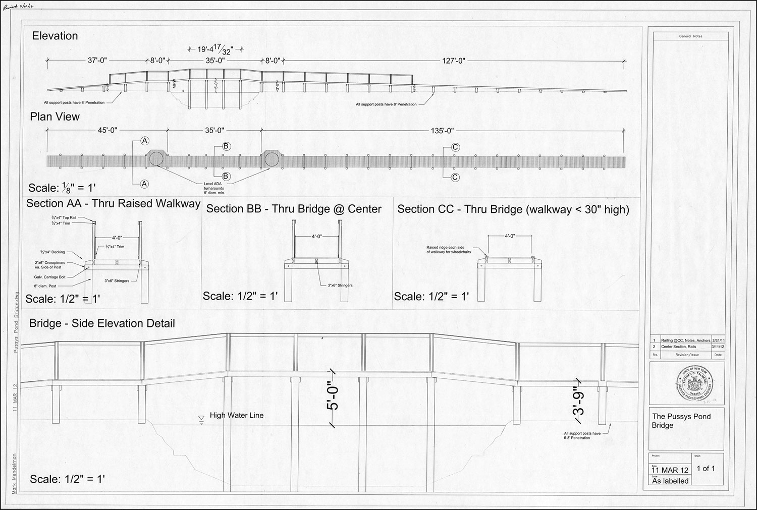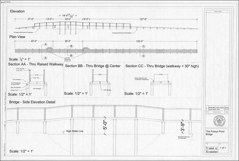Seen here is the plan for the bridge over Pussy’s Pond that was completed in 2013. The first was built in 1995 by the East Hampton chapter of Waterfowl U.S.A., a charitable organization dedicated to the conservation of wetlands. By 2009, the bridge had been declared unsafe due to storm damage and vandalism. Fund-raising efforts were undertaken to build a new one, and ground was broken in October of 2012.