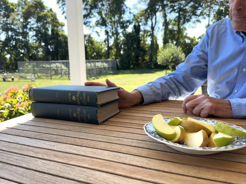 “We got more from different places as we went along. Being a historian, and liking research and books, that’s when I really started learning more about the varieties and what would be fun.” He found a Cox’s Orange Pippin tree (“raised from a seed [pip] by Richard Cox about 1825”), which he called his favorite apple, in the orchard in Bridgehampton, and planted a Grimes Golden (“originated in West Virginia, first record of the apple is its sale to New Orleans traders in 1804. A parent of Golden Delicious”) after learning it was someone else’s favorite.