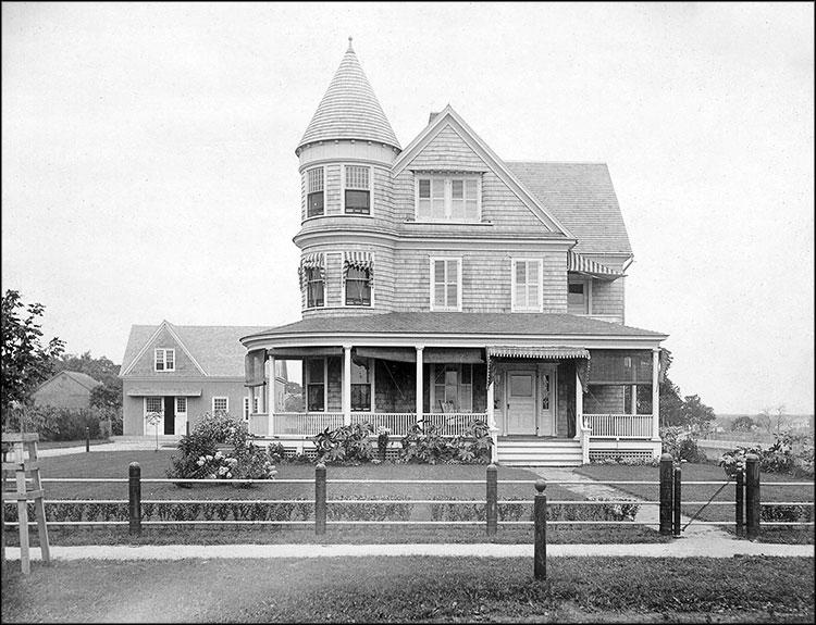 This photo shows the house in its original majesty, capturing with clarity every cedar shake and the cozy awnings with elaborate shades. Beautiful plantings appear around the house. The photo is undated, but it was most likely taken with a glass-plate negative, a technology that allowed for extreme clarity and detail. Glass-plate negatives largely went out of use by the 1920s as photographic technology advanced.