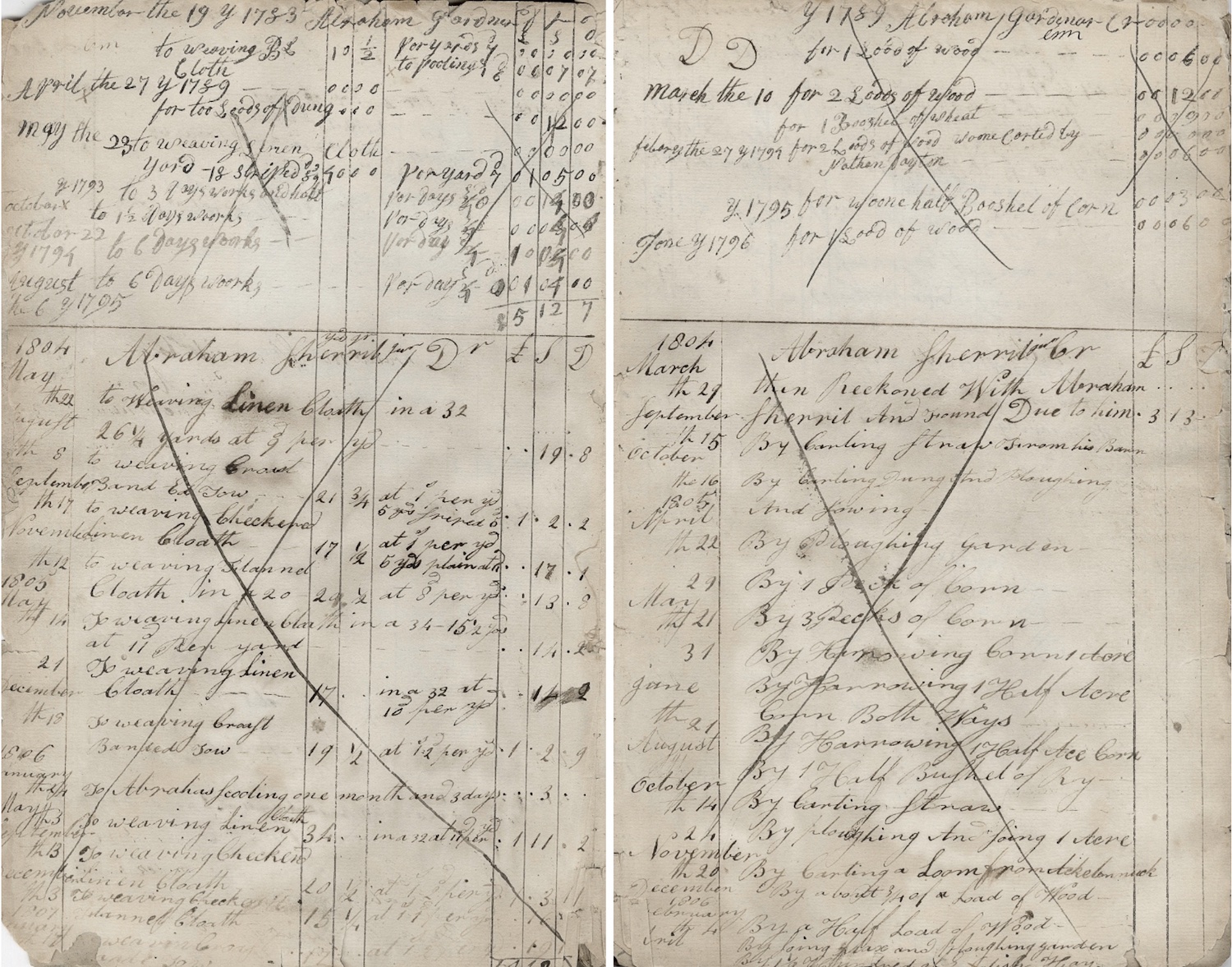 The younger Benjamin's records are more detailed; he often records the duration spent on each project. The accounts reference linen, flannel, wool, and tow (a rough jute or flax weave). In later entries are more technical weaving terms like cross banded, disappear, and worsted (a type of finely knit cloth from wool).