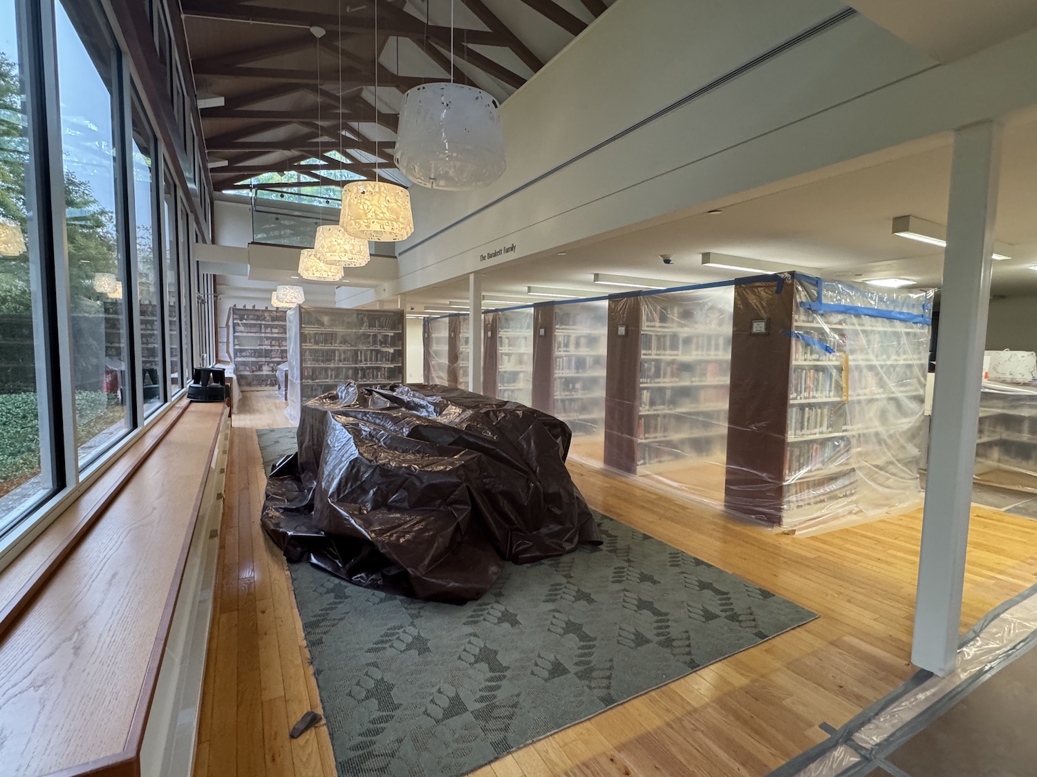 Bookshelves in the back room, a large, open space featuring floor-to-ceiling windows looking out on the back lawn, have been carefully coated in plastic sheeting. “It’s wonderful for events,” Ms. Michne said of the space, “but also people just come relax, have a coffee, read a book.”
