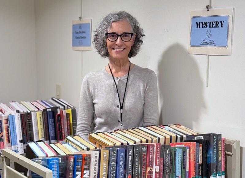“People aren’t coming as much, and we miss them, but we are here,” Ms. Michne said. She led the way back through the room and around the corner to the Geri Bauer Art Gallery, where a temporary “browsing area” has been set up for patrons. Carts were lined up against the back wall, filled with books “from all the different genres and subjects,” along with a selection of periodicals. Patrons often stop by for a photocopy of the daily New York Times crossword puzzle, Ms. Michne noted.