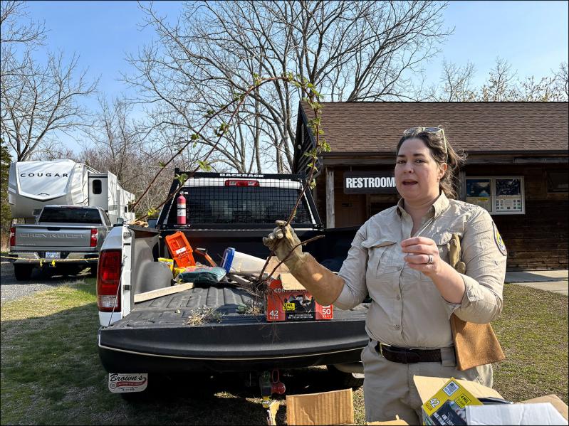 Ms. Willi pointed to an area that was managed for wineberry five years ago. It was still relatively clear, she said, as she sprinkled a native seed mix over the newly cleared area by the entrance.
