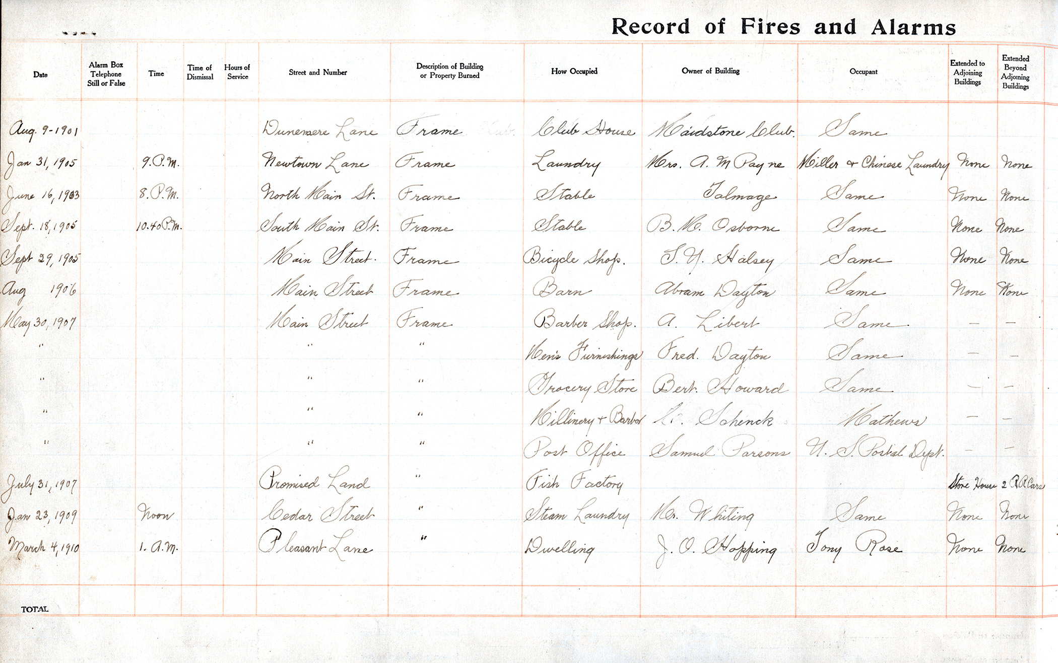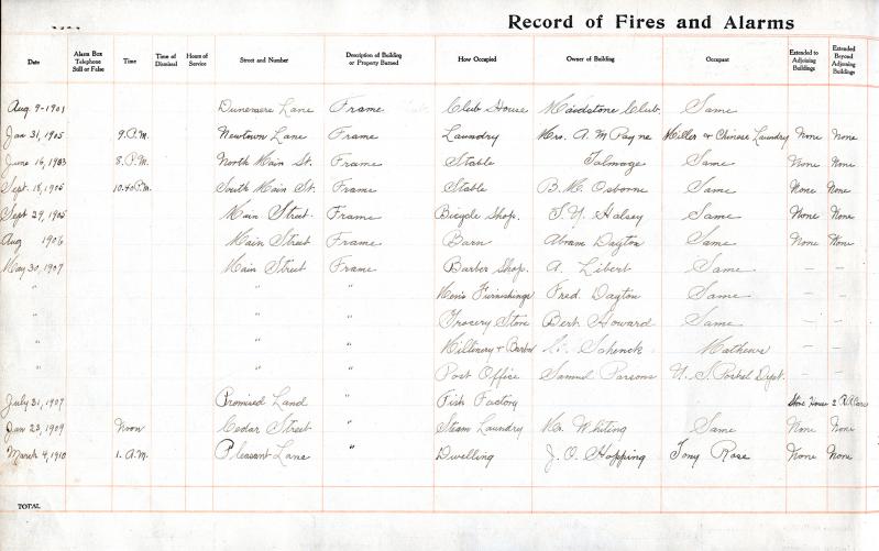 The first fire recorded in this log was a conflagration that destroyed the Maidstone Clubhouse in the early hours of Aug. 9, 1901. Upon arriving at the scene, the hose team determined that the clubhouse could not be saved and subsequently moved to prevent sparks from catching on neighboring structures.