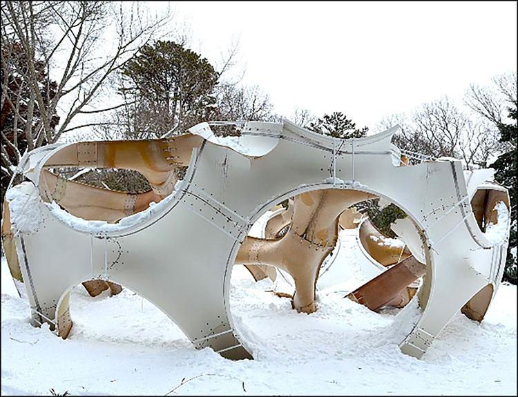 Buckminster Fuller’s iconic “Fly’s Eye Dome,” produced by his student John Kulick and installed at LongHouse in 1998, collapsed under the weight of the heavy snow. One of only five extant, it was acquired in 2017 by Jack Lenor Larsen, LongHouse’s founder.