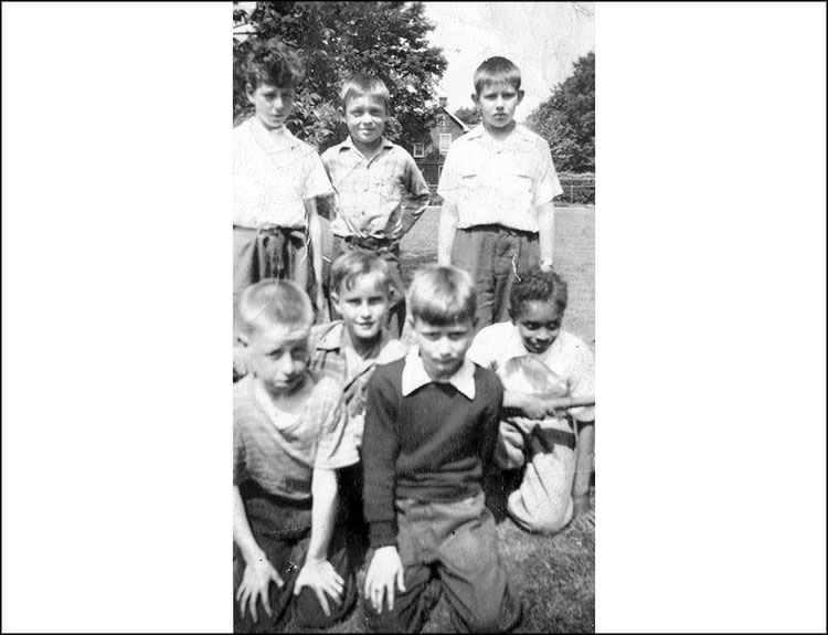 For his birthday, Sherrill invited his friends from school over to his house to play a game of baseball. His father, Frank Dayton (1903-1992), probably snapped this photo of the boys in front of the Dayton homestead. Sherrill’s friends in the top row, left to right, are Floyd Bennett (1935-1978), Pat Parsons (1936-1967), and Bobby Amann (1936-2013). Kneeling in the bottom row, left to right, are Bobo Walcott (1935-1978), Alfred King (1936-2003), Sherrill Dayton, and Orville Pryor (1937-2019).