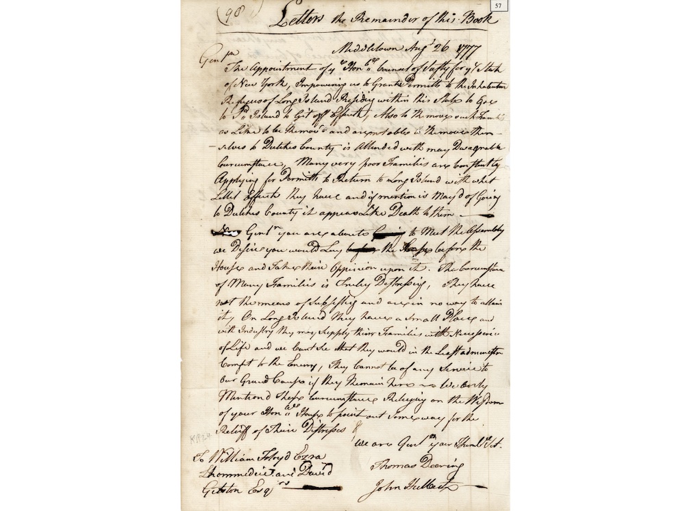 Thomas Dering and John Hulbert co-authored this letter on Aug. 26, 1777, replying to the New York Council of Safety’s letter appointing them as the representatives responsible for issuing permits for the refugees in Connecticut who’d fled Long Island’s British occupation. After Long Island fell to the British Army in September 1776, a large number of Long Islanders left the occupied Island for Connecticut. As time went on, people needed permits to cross between territory controlled by different armies. Many refugees returned to check on their property or retrieve possessions.