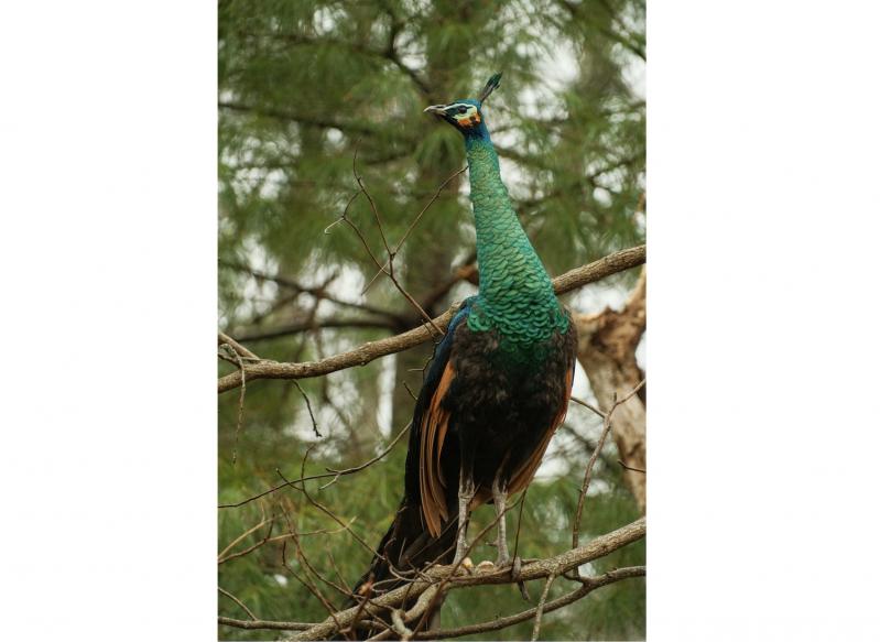 The peafowl, colloquially known as a “peacock” in America — males are properly called peacocks, while the females are peahens; the Clearwater bird is a male — is native to India and was introduced to America only in 1879 “when Elias J. ‘Lucky’ Baldwin brought three pairs to his vast ranch in the San Gabriel Valley of California,” according to the website birdsoftheworld.com. Populations now persist in Florida (of course) and California.