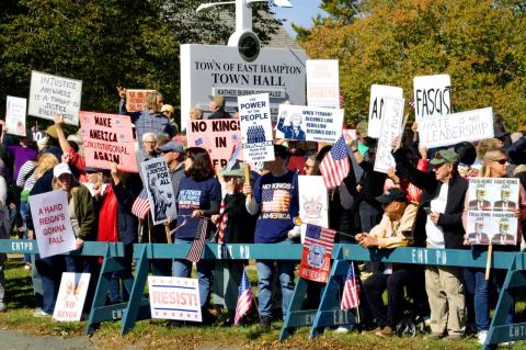 A crowd that was estimated at 2,000 to 2,500 and included several Democratic elected officials gathered at East Hampton Town Hall on Saturday for the latest "No Kings" protest against the Trump administration.